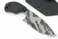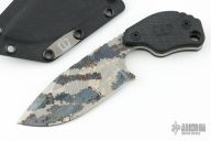 This SLCC by Mick Strider features a titanium digicam blade with a notched thumbrest, .189" blade stock and 1.552" blade depth, full tang construction. The handle has checkered black G-10 scales. Comes with a kydex sheath, original box and COA dated Microbatch 2025. New from maker at the 2025 Blade Show Texas.