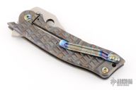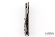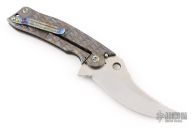 This knife by Steve Ryan features a satin finished upswept blade with thumbhole and serrated top edge. The handle has flame anodized milled titanium slabs, and tip up clip. Nice detent, lockup and blade seating. Comes in a Bill's case. Excellent condition.