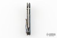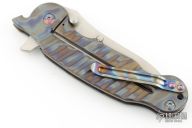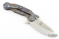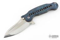 This knife by Steve Ryan features a satin finished up-swept blade with thumbhole and flipper. The handle has a black/blue g10 cover, milled and flamed titanium frame and tip up clip. Nice detent, lockup and blade seating. Comes in a Bill's case. Has a few light scratches, otherwise excellent condition.