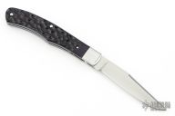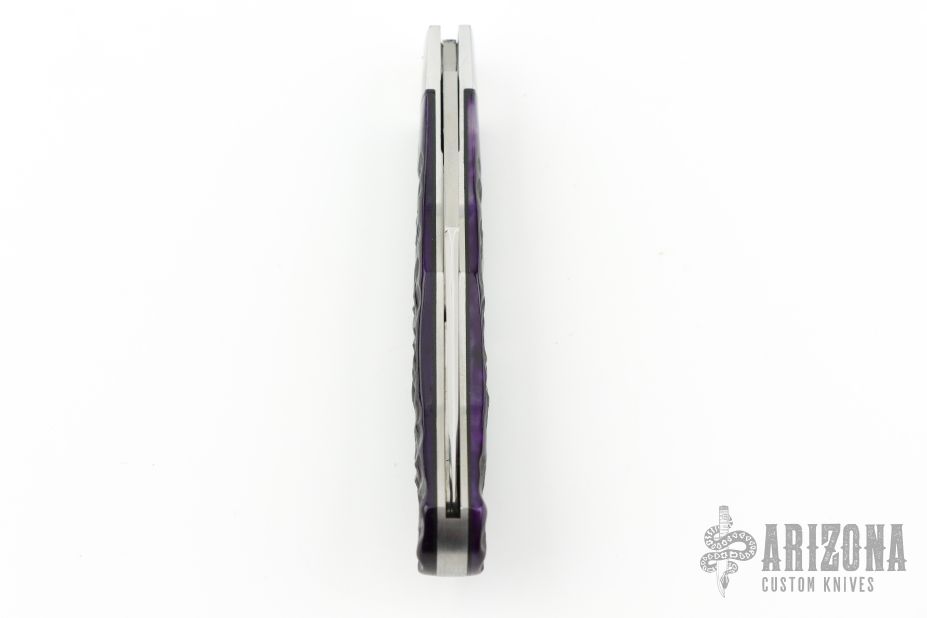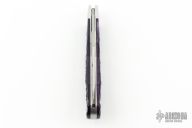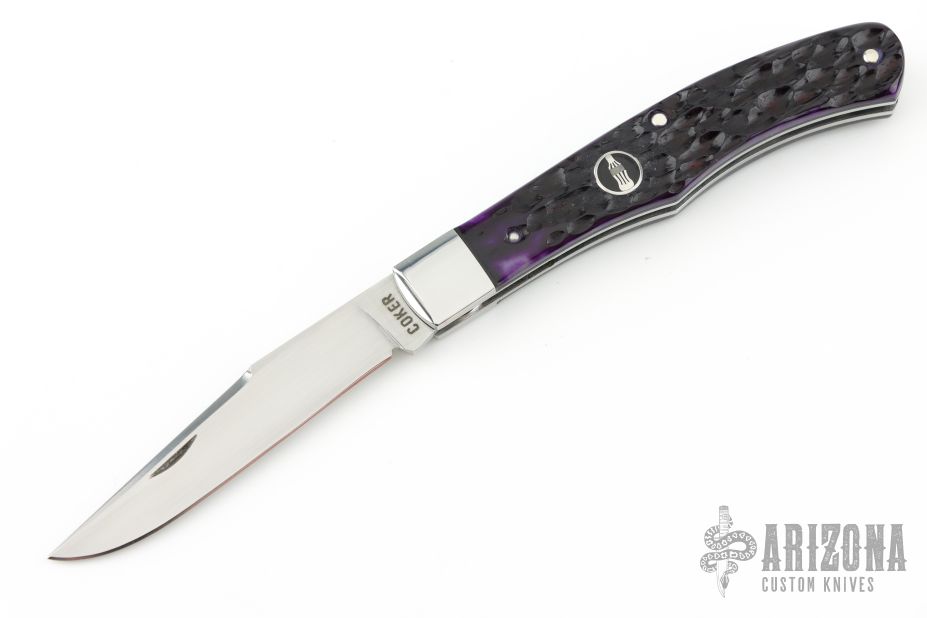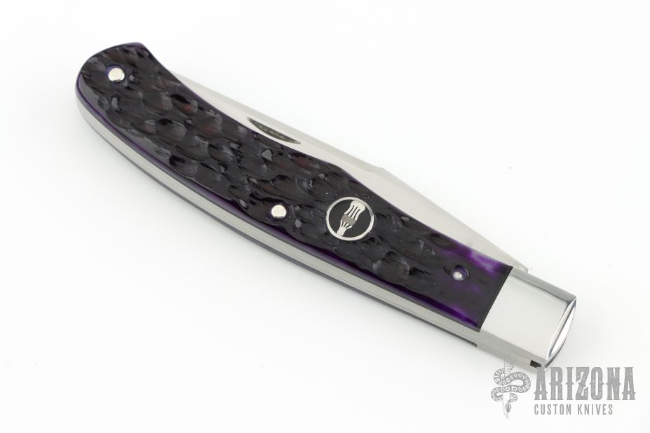 This Trapper by Michael Coker features a hand rub satin finished blade with nail nick. The handle has pinched and polished stainless steel bolsters with integral liners, Violet Culpepper Jigged Bone covers with black liners and a Coke Bottle Mosaic Shield escutcheon, interior of liners are jeweled, stainless steel spring with half-stop, flush in all positions. Nice pull and blade seating. Comes with a zippered case. New from maker at the 2025 Blade Show Texas.