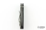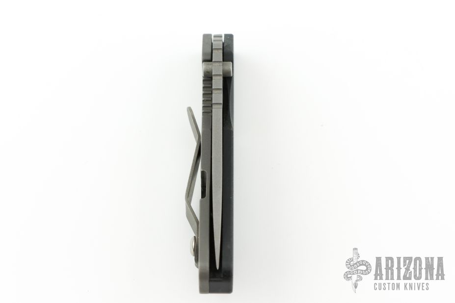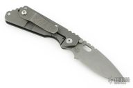 This PT by Strider Knives features a bead blasted drop point blade with thumb hole, dual thumb studs and notched thumbrest. The handle has black G-10 show side and backspacer with a bead blasted titanium lock side with tip up clip. Lanyard hole in pommel. Has some scuffs/scratches, has been sharpened, otherwise good condition.