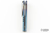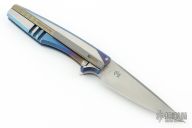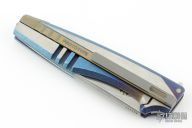 This IKE by Max Knives and Torpen Knives features a stonewashed blade with flipper and notched thumbrest. The handle has an integral two-tone anodized titanium frame, anodized titanium accents, and tip down titanium clip. Has a stainless lockface insert. Comes with a zippered case and pamphlet. One of 120 pieces made, this one is one of the Prototypes. New from maker at the 2025 Blade Show Texas.