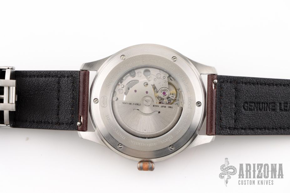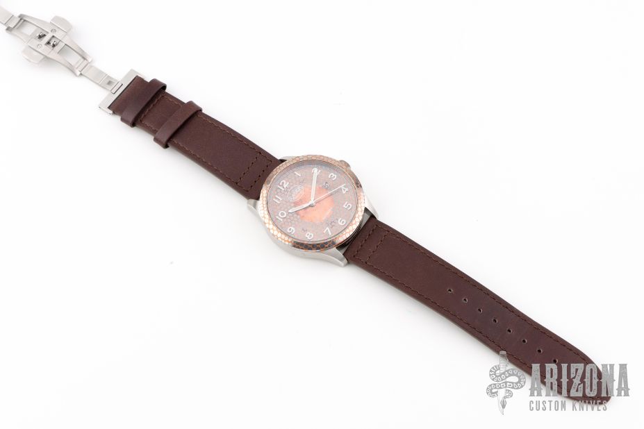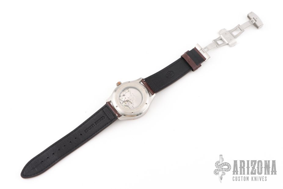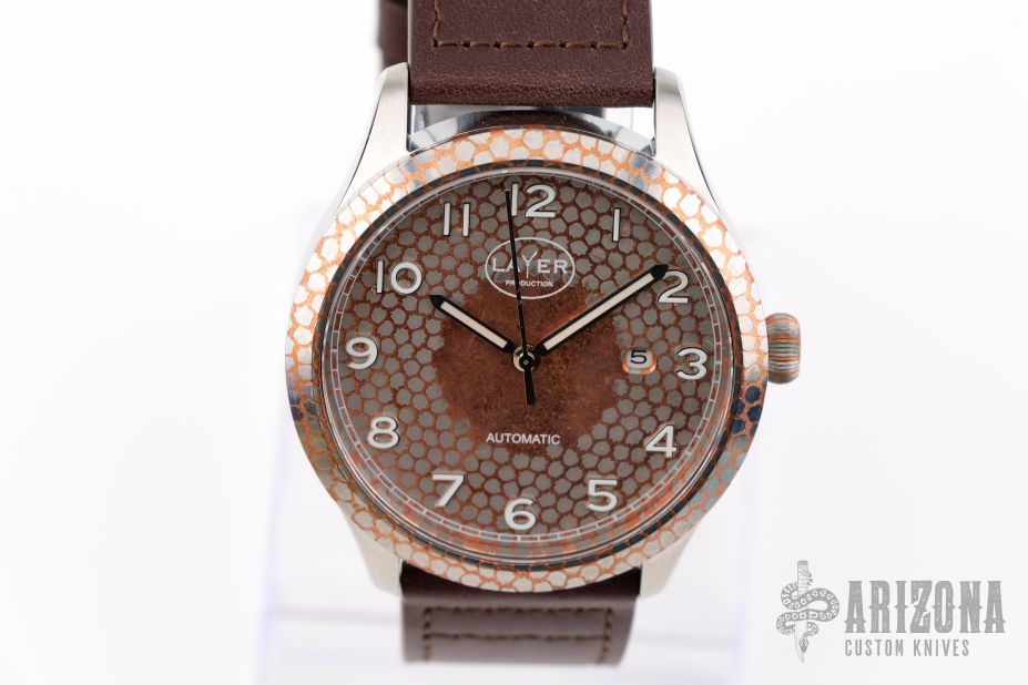 This Production Prototype Watch by Layer Watches has a 316L Stainless steel case, super conductor bezel and Dial, sapphire glass front and back, Japanese automatic Miyota 8215 movement. This one is one of a kind. 43mm case and 13mm thickness. Leather strap. Comes with a Velcro case and COA. New from maker at the 2025 Blade Show Texas.