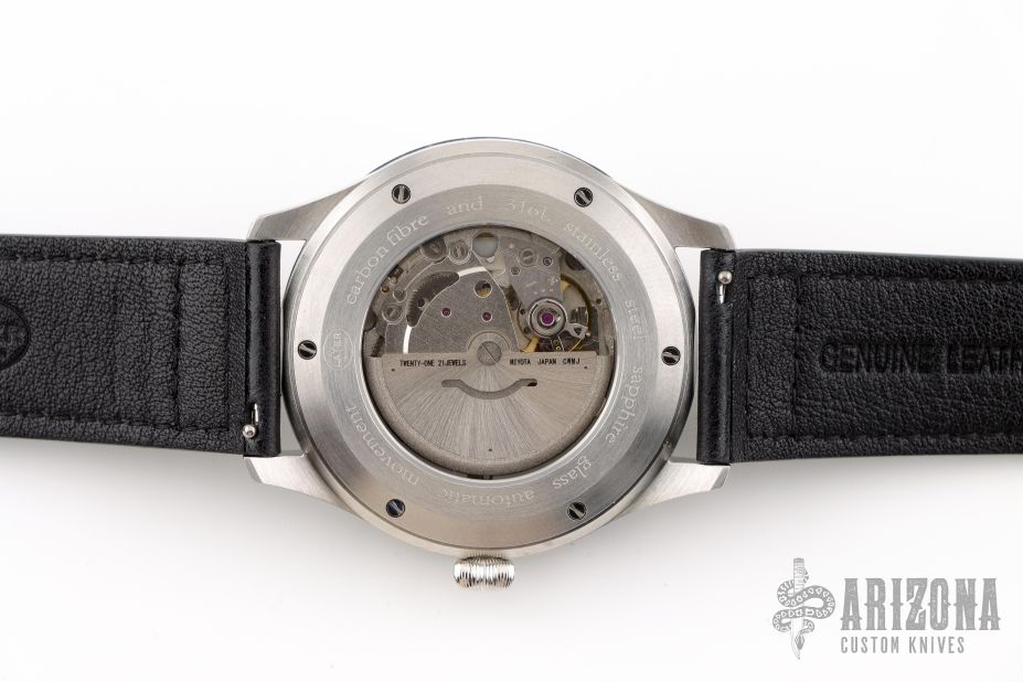 This Production Prototype Watch by Layer Watches has a 316L Stainless steel case, Forged Carbon bezel and Dial, sapphire glass front and back, Japanese automatic Miyota 8215 movement. This one is one of a kind. 43mm case and 13mm thickness. Leather strap. Comes with a Velcro case and COA. New from maker at the 2025 Blade Show Texas.