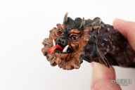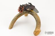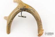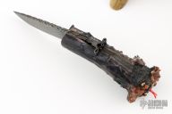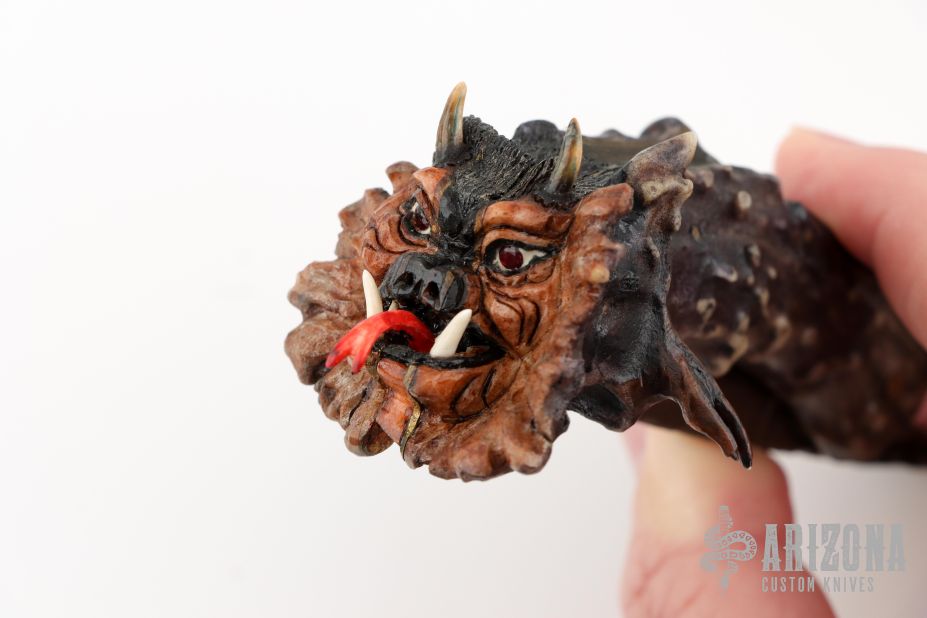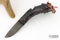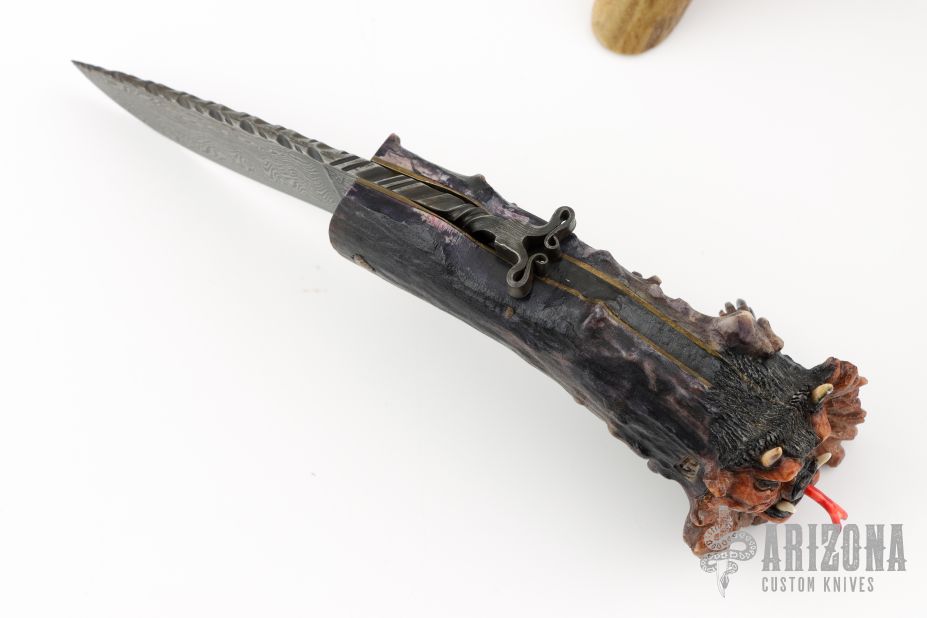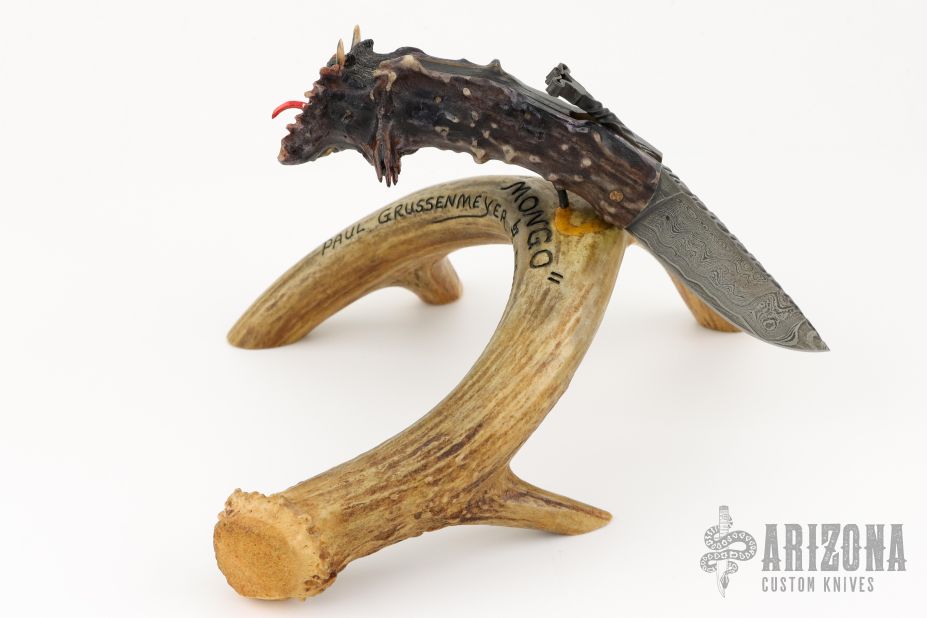 This "Mongo" Goblin friction folder by Master Smith Daniel Winkler was carved by master carver Paul G Grussenmeyer. It features a Damascus blade with fileworked spine and decorative friction bar. The handle has a crown stag grip with brass liners. The butt has been carved with "Mongo" the goblin by Paul G Grussenmeyer, it has ivory fangs and ruby or garnet eyes, even has a little carved hand on one side of the knife. Comes with a stag display stand. Really nice example of Daniel's custom work! Excellent condition. Comes with a zippered case. ONE OF A KIND.