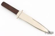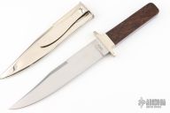 This Bowie by Jim Ence features a hand rub satin finished blade with a false top edge, .220" blade stock and 1.332" blade depth, full tang construction. The handle has a nickel silver guard with wood (rosewood?) scales. Comes with a nickel silver scabbard with clip. Has some light scratches on the guard, and the tip of the scabbard is bent, otherwise excellent condition. Comes with a zippered case.