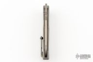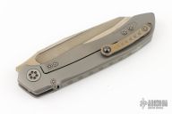 This knife features a bronzed tri-tone stonewashed tanto blade and a notched thumbrest. The handle has an integral bronzed titanium frame with optional lanyard attachment. Nice detent, lockup and blade seating. "A. Marfione" inside the frame and dated 08/2014 and s/n 014. Comes with original box, COA and zippered case. Listing also includes the "tail" attachement. Excellent condition.