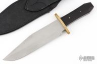 This Bowie by Kelgin Knives features a bead blast finished blade with false top edge, .235" blade stock and 1.969" blade depth, full tang construction. The handle has a brass guard and blackwood scales. Comes with a black leather sheath. Has some light patina spots, otherwise excellent condition.