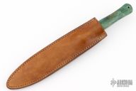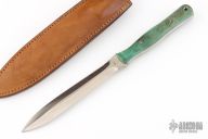 This custom dagger by John Roy features a satin finished double edged blade with notched thumb and finger rests, .255" blade stock and .935" blade depth, full tang construction. The handle has dyed wood scales with mosaic pins and lanyard hole. Comes with a brown leather sheath with boot clip. Excellent condition.