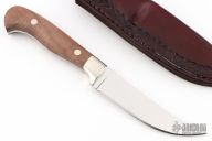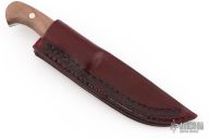 This fixed blade from Phillip M. Parris features a mirror polished upswept blade, .152" blade stock and .948" blade depth, full tang construction. The handle has dovetailed nickel silver bolsters and wood scales with nickel silver pins. Comes with a brown leather sheath with belt loop. Excellent condition.