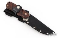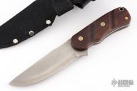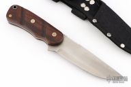 This knife by Boondock Knives features satin finished blade with notched thumbrest, .095" blade stock and 1.265" blade depth, full tang construction. The handle has India Rosewood scales with brass and stainless pins and stainless lanyard tube. Comes with a black nylon sheath. Excellent condition.