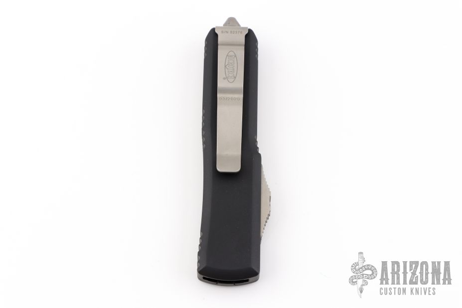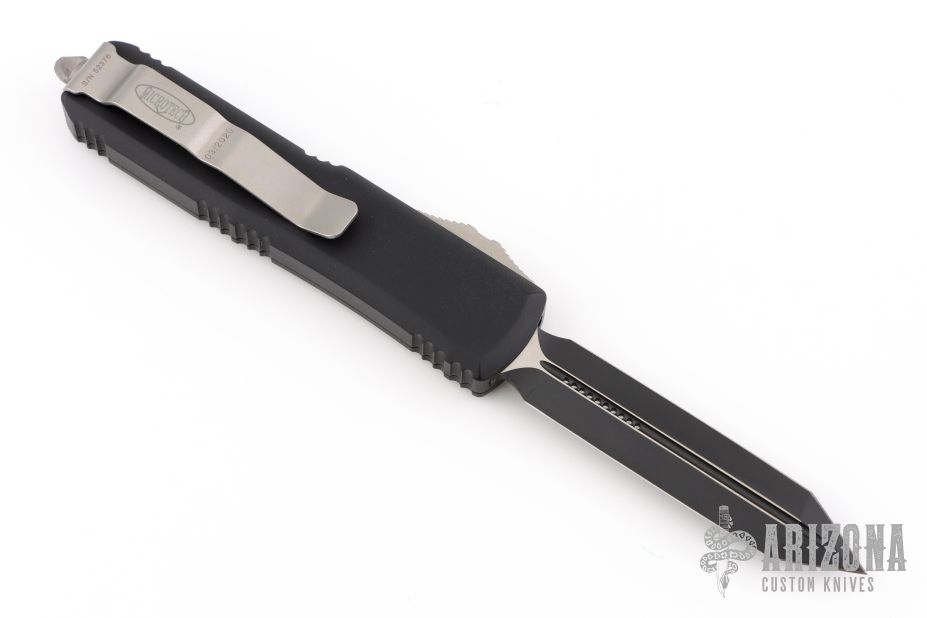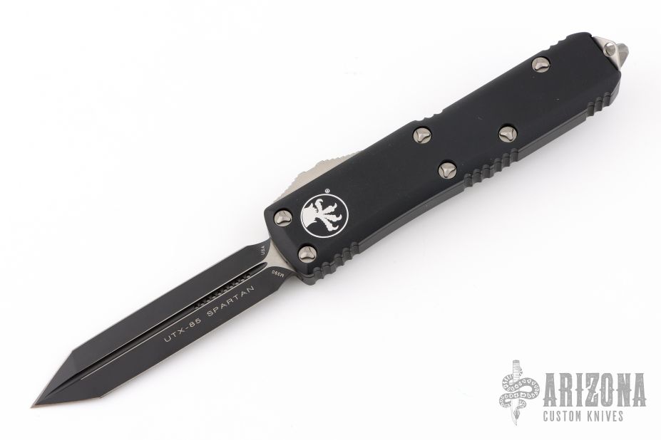 This UTX-85 OTF automatic by Microtech features a black double-edged "Spartan" blade. The handle has a black aluminum frame with all bead blasted hardware, tip down stainless steel clip. Serial number 52376 and dated 03/2020. Excellent condition.