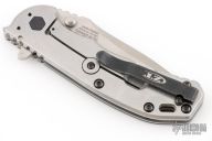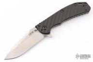 This 0566 Hinder Design Flipper by Zero Tolerance features a tumble finished drop point blade with swedge, dual thumb studs, notched thumb rest and flipper. The handle has a carbon fiber scale over a titanium liner and a tumbled titanium lockside over black barrel spacers. The black coated steel tip up clip is reversible for right or left hand carry. S/N 0502.  Has a couple light scratches, otherwise excellent condition.