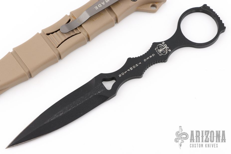 The Benchmade 176 SOCP Dagger is a Greg Thompson design. He is the creator of the Special Operations Combatives Program (SOCP) and has years of training and experience to draw from. This skeletonized dagger has a finger loop that makes it easy to deploy and use in quick order. It is made from 440C stainless steel with a black finish. The 176 SOCP includes a black sheath with clip and lanyard.