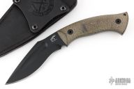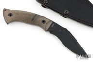 This Kukri features a black blade with a false top edge and a full tang construction.  .235" Blade Stock.  1.385" Blade Depth.  The handle features micarta scales.  Includes a black leather sheath by Positive Made and the original box. Excelletn condition.