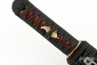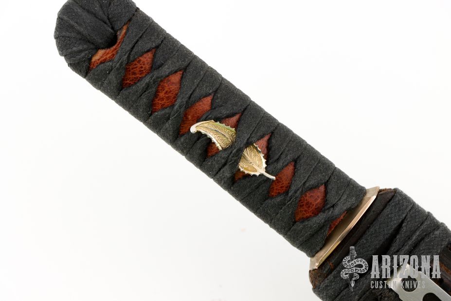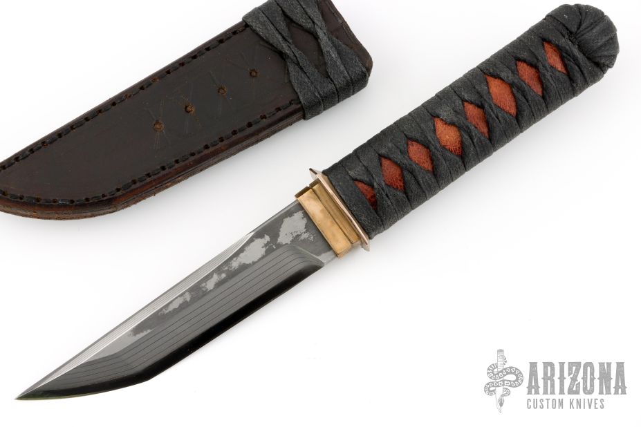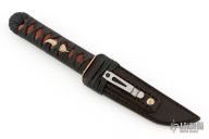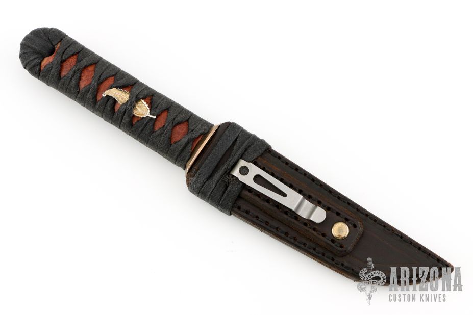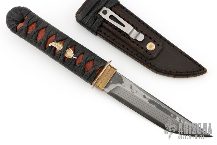 This Tanto by Chris Adelhardt of Pariah Knives features a Takefu San Mai Damacus blade with false top edge, .193" blade stock and .950" blade depth, hidden tang construction. The handle has has a brass habiki and tsuba, wood base with leather covering, black cord wrap with brass leaf menuki. Comes with a hand tooled black leather sheath with clip. Excellent condition.