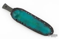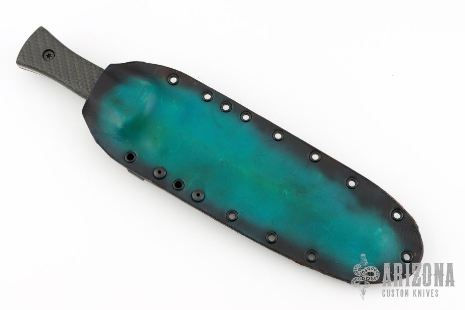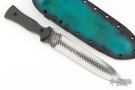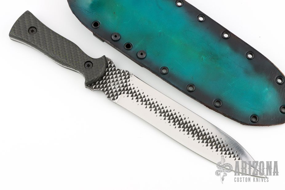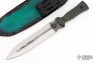 This Large Dagger by WarCrown Forge features a double edged blade made from a rasp, .193" blade stock and 1.626" blade depth, full tang construction. The handle has carbon fiber scales. Comes with a black/green leather sheath. Excellent condition.