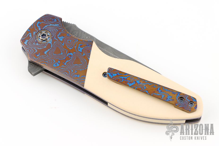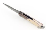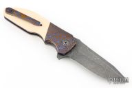 This RAINE Flipper by Kirby Lambert features a Damascus blade with notched thumbrest and flipper. The handle has Mokuti bolsters with copper pivot collars, ivory paper micarta scales, orange peel finish titanium liners, micarta backspacer, Mokuti tip up clip. Has some light scratches, otherwise excellent condition.