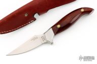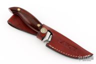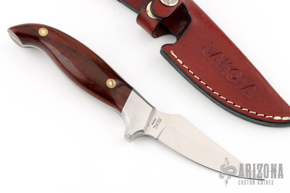 This FinWing by Lakota was produced by Moki. It features a satin finished blade with .120" blade stock and .875" blade depth, full tang construction. The handle has stainless steel bolsters, rosewood scales. Comes with a brown leather sheath. Has a few light scratches, otherwise excellent condition.