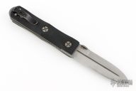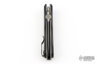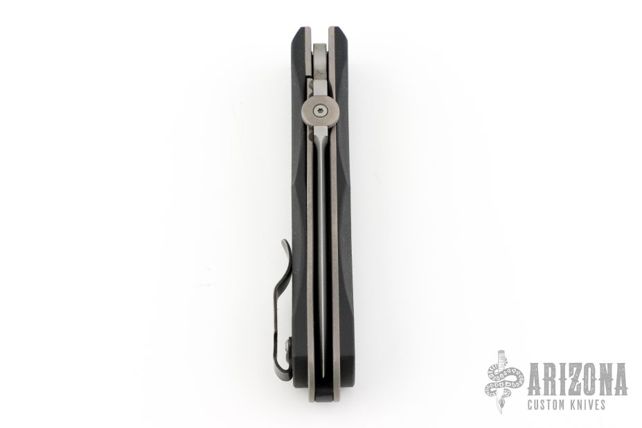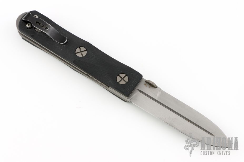 This EK Folder by Allen Elishewitz features a bead blasted blade with fullers, false top edge and a thumbdisc. The handle has black G-10 scales patterned after an EK Knives dagger, bead blasted titanium liners, tip up black stainless steel clip, black G-10 backspacer. Rides on bearings, nice detent, lockup and blade seating. Comes with velcro case. Has some light scuffs, scratches, and patina. Great condition otherwise.