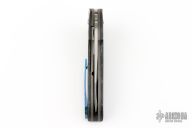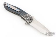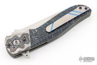This Turbo Charger from Greg Lightfoot features a two-tone finished blade, large swedge on spine of blade, flipper and notched thumbrest. The handle has Damascus bolsters with titanium pivot and polished/anodized titanium pivot collars, carbon fiber scales, blasted titanium liners, polished/anodized titanium clip, tip up carry, carbon fiber backspacer. Rides on bearings, nice blade seating, detent, and lockup. Comes with a hard case and COA. Has a couple light scratches, great condition otherwise.