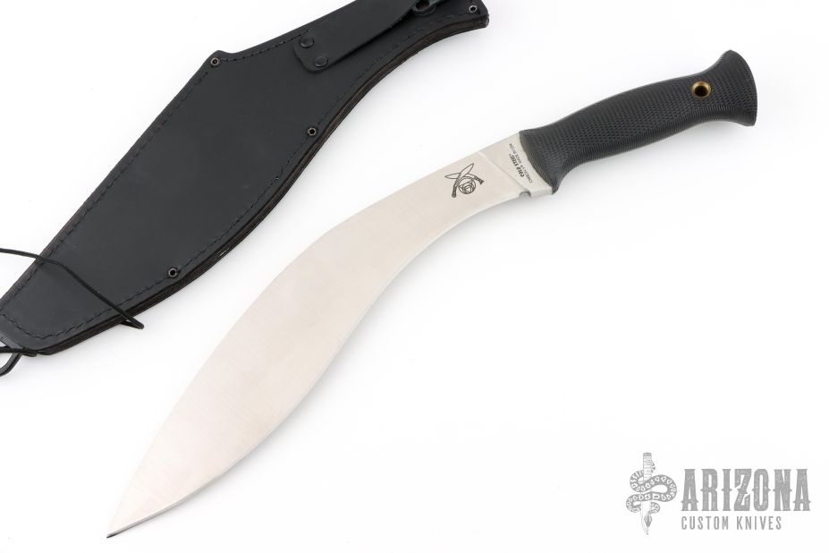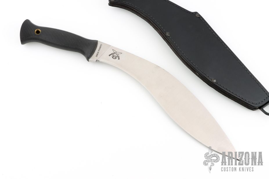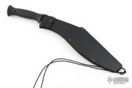 The Kukri blade, with its markedly downward curved blade, has long been identified with the Gurkha Warriors of Nepal, the ferocious mercenaries who have wielded this blade for over 150 years in the service of the British Empire. The Cold Steel Gurkha Kukri was inspired by Cold Steel President, Lynn C. Thompson’s close association with Dr. Maung Gyi, chief instructor of the American Bando Association, and a renowned martial artist with wide-ranging knowledge and skills. Under Dr. Gyi’s tutelage, Lynn gained insight into the full potential of the Kukri and learned it was not just a chopping weapon but a piercing, slashing, and smashing weapon as well. Smashing techniques allow the Kukri to function as a hammer or mallet or to deliver non-lethal blows in a self-defense role. A concentrated blow with the back of the blade can break bones or be lethal if directed at the head. With Dr. Gyi’s input, Thompson designed a longer, narrower point for the Gurkha Kukri with more distal tapering to the spine. This resulted in a thinner, sharper point which can be deeply driven into thick, tough targets with minimal effort. Finally a masterfully designed Kraton handle was added to maximize the blade’s fierce potential. Perfectly contoured and deeply checkered, it offers a superb non-slip grip and cushions the hand from the shock of the hardest blow. The Gurkha Kukri’s Carbon V blade will out-chop any factory or handmade knives; including swords twice its size, even expensive, hand forged Japanese Katanas. It’s the heaviest Kukri on the market. The blade is almost an inch wider near the tip than at the handle, shifting the knife’s balance point forward to allow a substantial blow to be struck with minimal effort, using inertia alone to complete the cut. Each Gurkha Kukri is supplied with a black leather sheath to protect the blade and allow you to wear it safely and securely on your side always ready to defend you and your loved ones. Excellent condition. Comes with original box and black leather sheath.