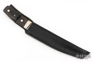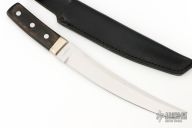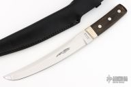 This knife by Parker Cutlery Company features a mirror polished blade with false top edge, .196" blade stock and 1.340" blade depth, full tang construction. The handle has nickel silver bolsters and dymondwood scales. Comes with a black leather sheath. Excellent condition.