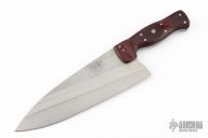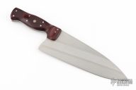 This Chef's Knife by Lowell Bray features a satin finished blade, .106" blade stock and 2.690" blade depth, full tang construction. The handle has maroon linen micarta scales with mosaic and stainless steel pins. New from maker.