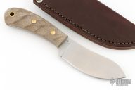 This knife by LT Wright features a satin finished flat ground blade with .120" blade stock and 1.263" blade depth, full tang construction. The handle has green micarta scales. Comes with a brown leather sheath. Excellent condition.