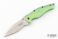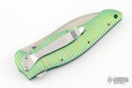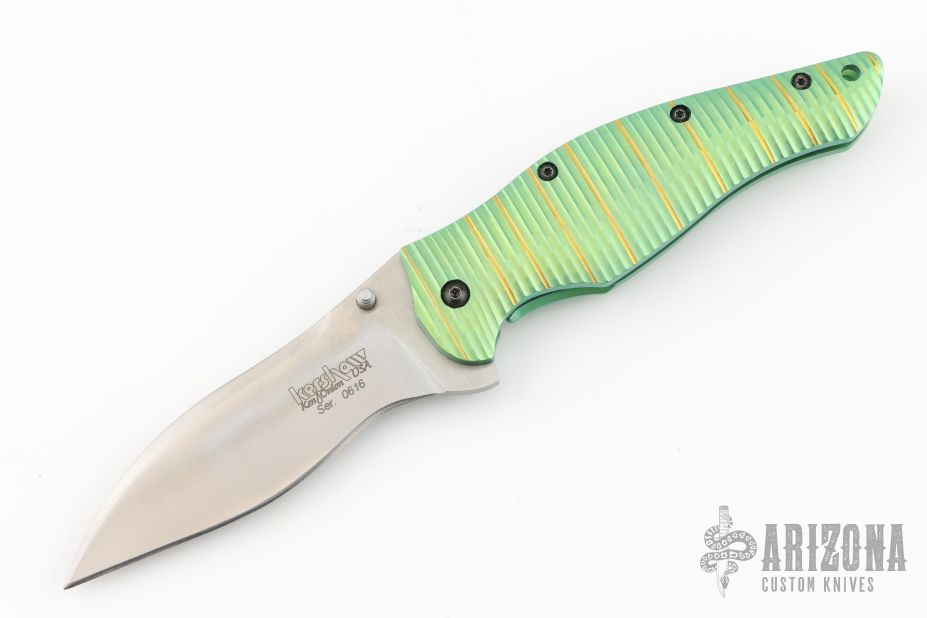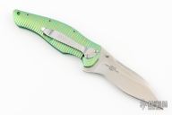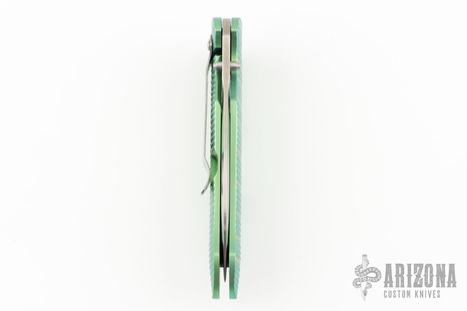 This Bump 1590GR (#0616) assisted opening flipper from Kershaw has a satin finished S30V stainless steel spear point blade with dual thumb studs. Handle is fluted green titanium, tip down stainless steel clip, and lanyard hole. Has a couple light scuffs, excellent condition otherwise.