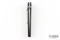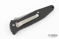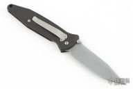 This manual Socom liner lock folder by Microtech features a silver coated plain edged blade with dual thumbstuds and notched thumbrest. The handle has a black aluminum frame with rubber inlays. Dated 10/98. Has some light scuffs and scratches, great condition otherwise.