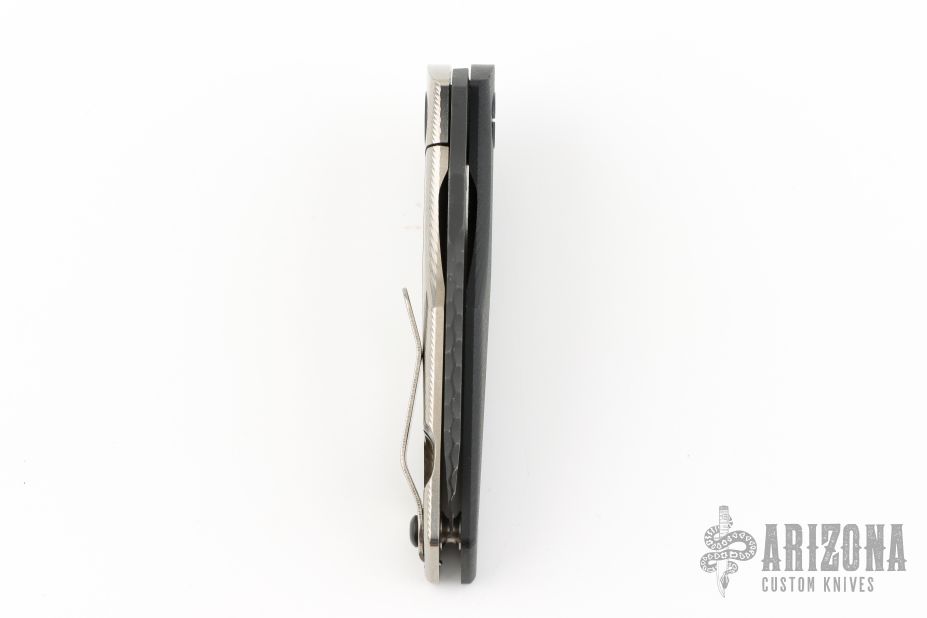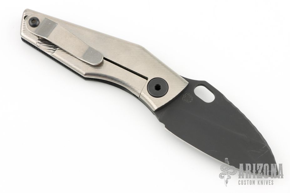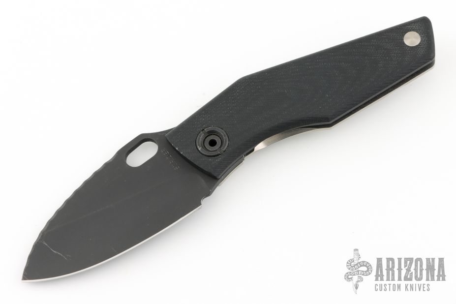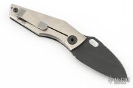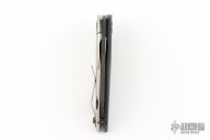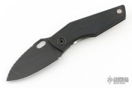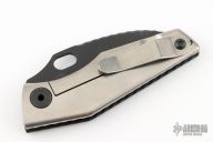 This SJ75 Baby Huey framelock folder by Strider Knives has a black finished blade and a black G-10 and milled titanium frame with tip up titanium clip. File work on blade spine and inner edges of frame along the spine. Has some light scuffs and scratches, Excellent condition otherwise.