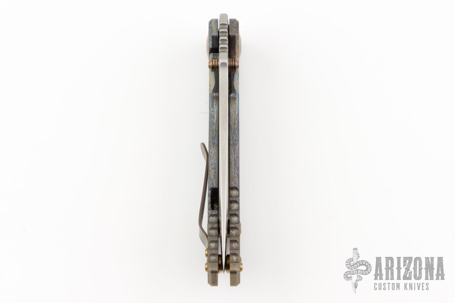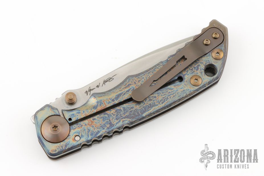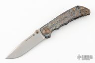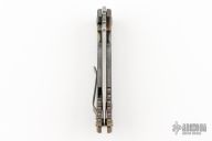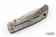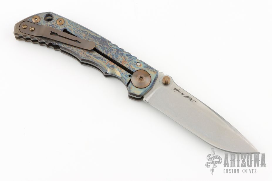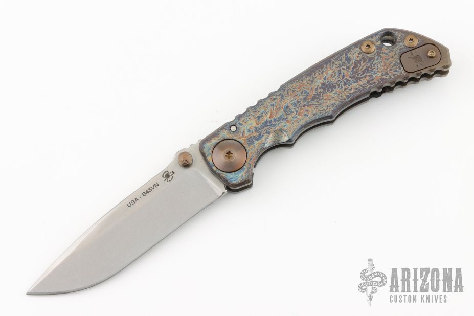 This framelock folder by Spartan Blades features a stonewashed drop point S45VN blade with dual thumbstuds and a notched thumbrest. The handle has a custom anodized titanium frame with tip up titanium clip. Has nice detent, lockup, and blade seating. Has a couple light scuffs, excellent condition otherwise.