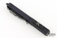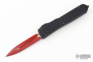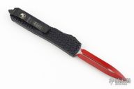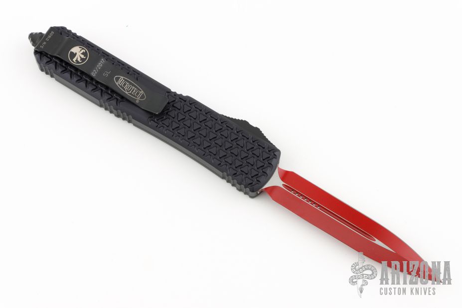 This Ultratech OTF automatic by Microtech features a D/E red blade. Black aluminum contoured frame with black tip down stainless steel clip. Dated 05/2017 and s/n 01609. Comes with original box and papers. Has a ding on the clip. Excellent condition otherwise.
