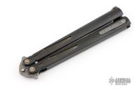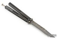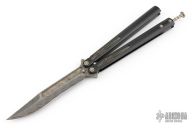 This Tachyon III balisong by Marfione Custom Knives has a Chad Nichols Elmax Core Boomerang Damascus blade with sharpened clip point. The handles are integral DLC stonewashed titanium with spring latch and a matching damascus tip up, retractible clip. Includes original zippered case. Dated 11/2016. Has a couple light scuffs, otherwise excellent condition.