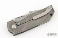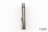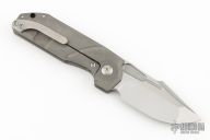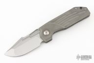 This SnappyBoi is a Jason Stout design, produced by Reate. It features a belt satin blade with thumbhole and notched thumbrest. The handle has a tumble/bead blast finish titanium frame, backspacer, and tip up clip. Has lock face insert. Comes with original box. New from maker!