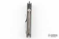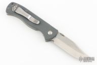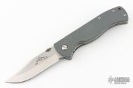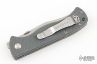 This PoBoy EX-100 from Emerson Knives features a stonewashed blade with knurled thumbdisc and notched thumbrest. The handle has textured gray g10 scales, with titanium liners, posts and stainless tip up clip. Comes with original box and papers. Excellent condition.