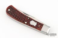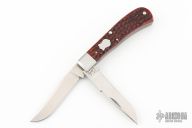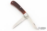 Case and Tony Bose collaboration in 2000. Two satin finish blades with half stops. Satin stainless bolster and chestnut colored jigged bone scales with stainless shield escutcheon. Very well made knife for a fraction of a custom Bose trapper. Has a couple light scuffs, excellent condition otherwise.