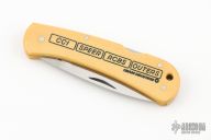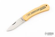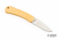 This lockback by Gerber Knives has a polished drop point blade with a nail nick. The handle has vintage paper micarta covers, and stainless rocker bar. Comes with original box, 1983. Like new condition.