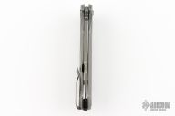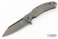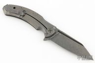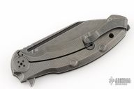 This Trigger by Bastinelli Knives features a dark stonewashed D2 blade with fullers, notched thumbrest and a flipper. The handle has a dark stonewashed and milled titanium frame with a matching tip up stainless steel clip, standoffs. Rides on bearings, nice detent, lockup and blade seating. Comes with original box. Excellent condition.