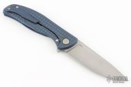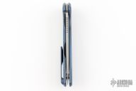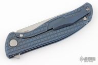 The Frame: The scales are titanium in Monkey Edge FRAG Pattern with a tumbled blue anodized finish. Machined titanium pocket clip with matching finish. Custom pivot, scale hardware and clip screw with blasted finish