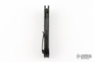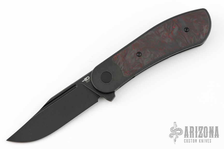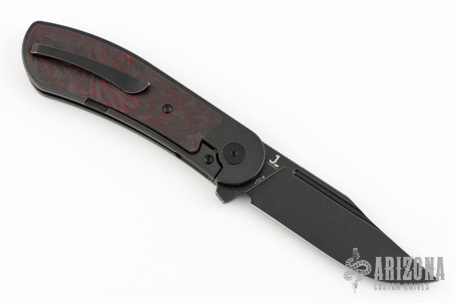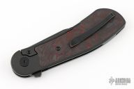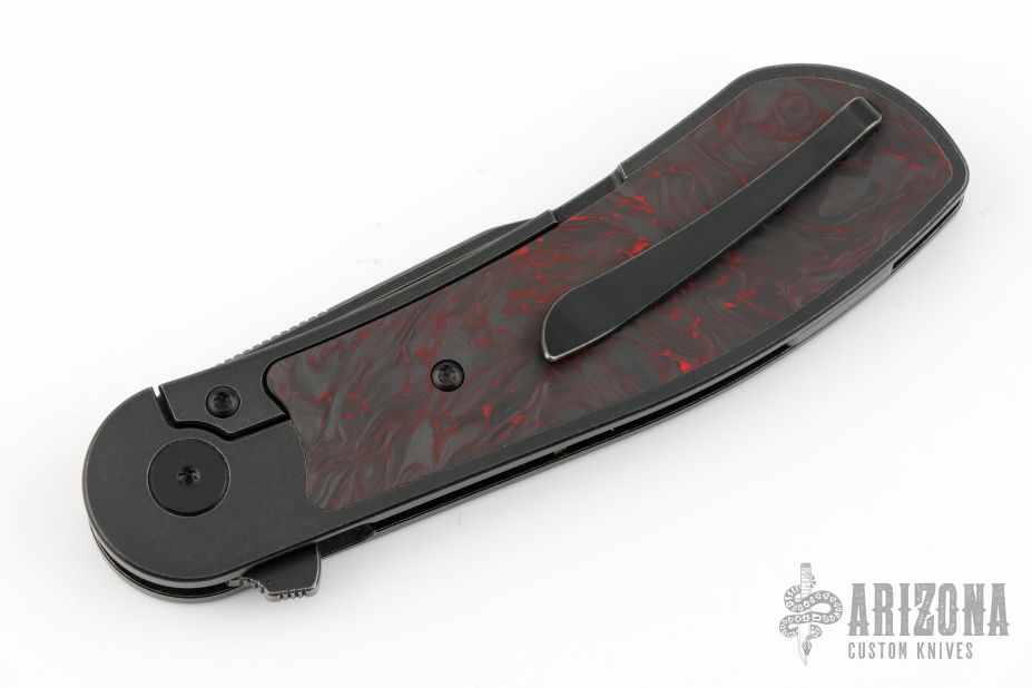• Handle: Black stonewash titanium handle with red marbled carbon fiber inlays.