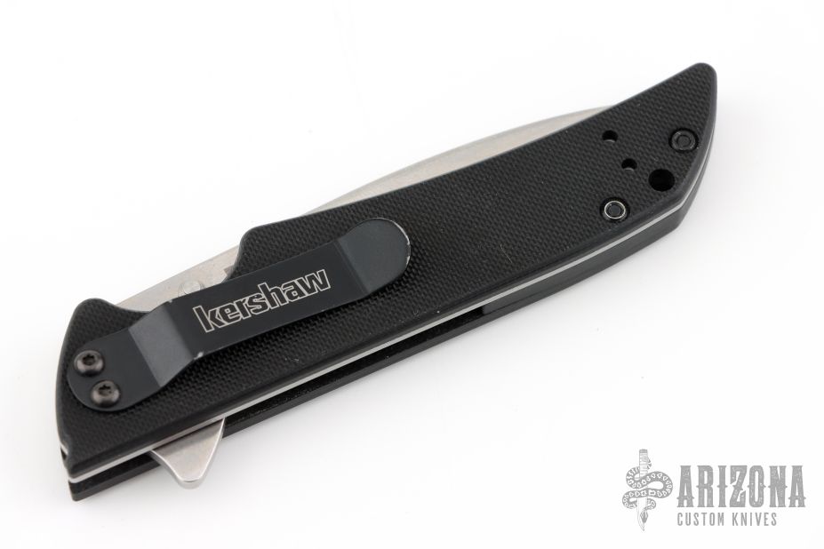 This Skyline by Kershaw features a bead blasted drop point blade with dual thumbstuds and flipper. The frame has G10 scales and a stainless tip down pocket clip. Has a couple scuffs, otherwise Excellent condition.