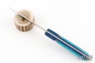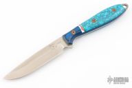 This Custom Shop Steak Knife by Busse features a drop point satin finished ELMAX blade, .087" blade stock and .860" blade depth, full tang construction. The handle has blue/black g10 covers with turquoise overlay and extended tang with lanyard hole. Excellent condition.