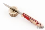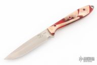 This Custom Shop Steak Knife by Busse features a drop point satin finished ELMAX blade, .091" blade stock and .845" blade depth, full tang construction. The handle has bone/red epoxy covers, and extended tang with lanyard hole. Excellent condition.