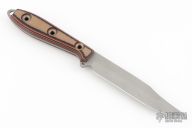 This Custom Shop Steak Knife by Busse features a clip point bead blast finished ELMAX blade, .091" blade stock and .850" blade depth, full tang construction. The handle has black/red/tan textured g10 covers, and extended tang with lanyard hole. Excellent condition.