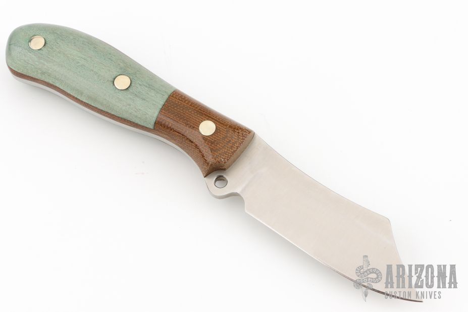 This Trustee Warden by the Busse features a satin finished clip point blade, .160" blade stock, 1.091" blade depth, full tang construction. The handle has micarta covers with blue wood overlay. Excellent condition.