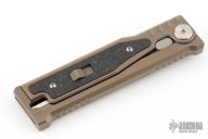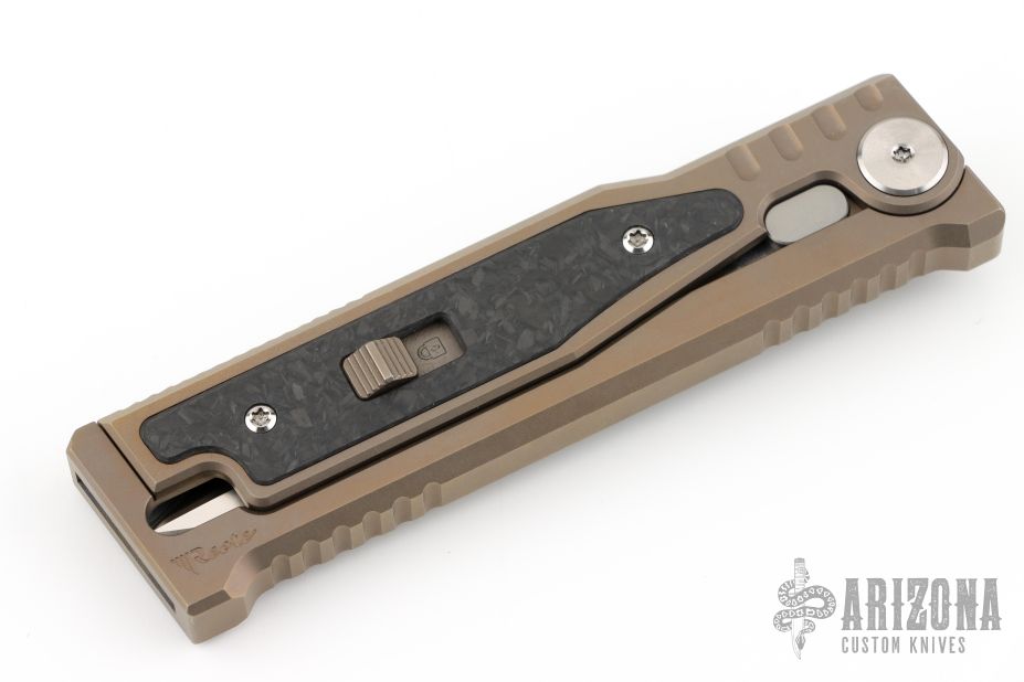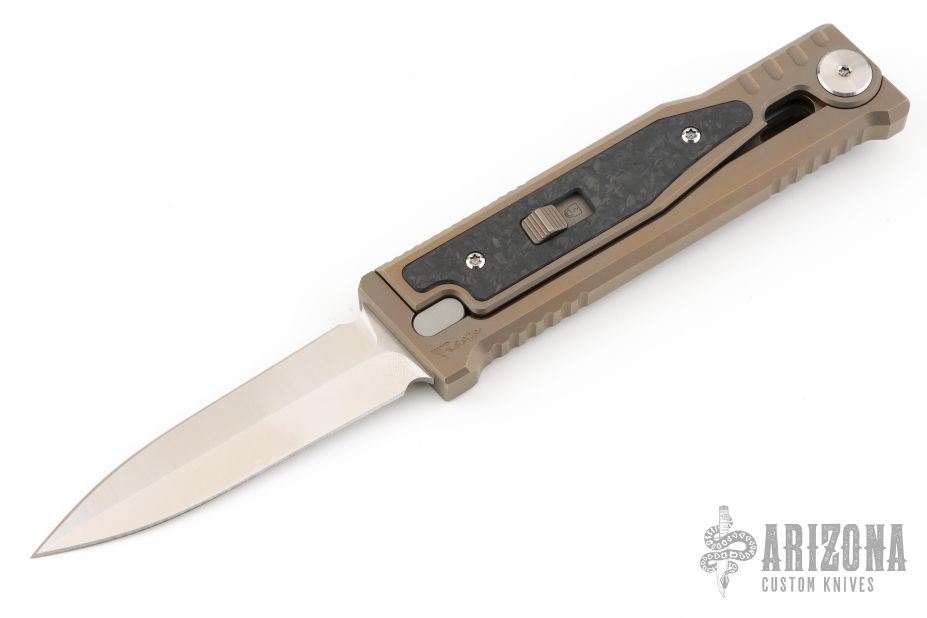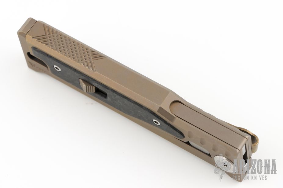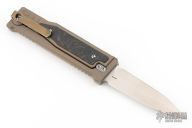 EXO-M Gravity knife. Double edged blade, bronze anodized titanium handle, marble carbon fiber inlays. Comes with original box, and accessories. S/N 005 dated 07/2023. Includes the original box and papers. Excellent Condition.