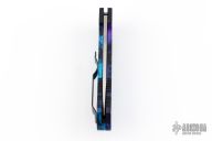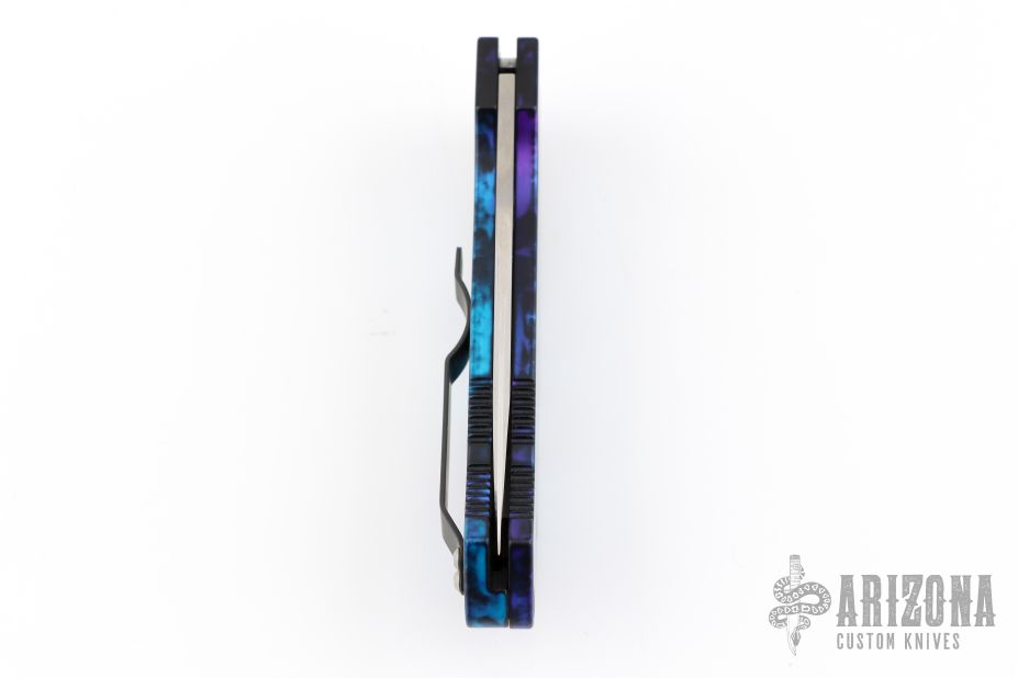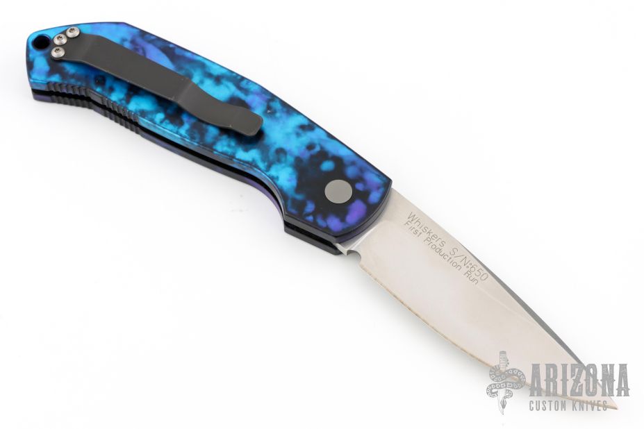 The Protech Magic is a Mike "Whiskers" Allen design, scale release automatic knife. This knife has a stonewash finish spear point blade and a Jazz anodized aluminum handle with a black stainless steel tip up clip. The automatic opening blade is activated by pivoting the top scale at the bottom of the handle. Pivot the scale again to release and close the blade. #650. Comes with original box. Excellent condition.