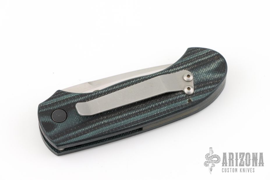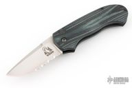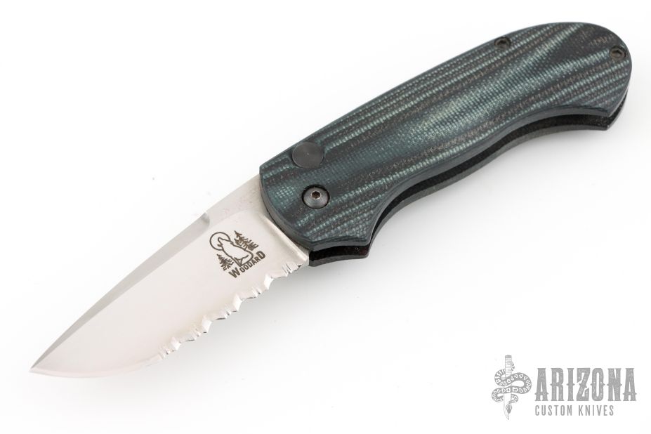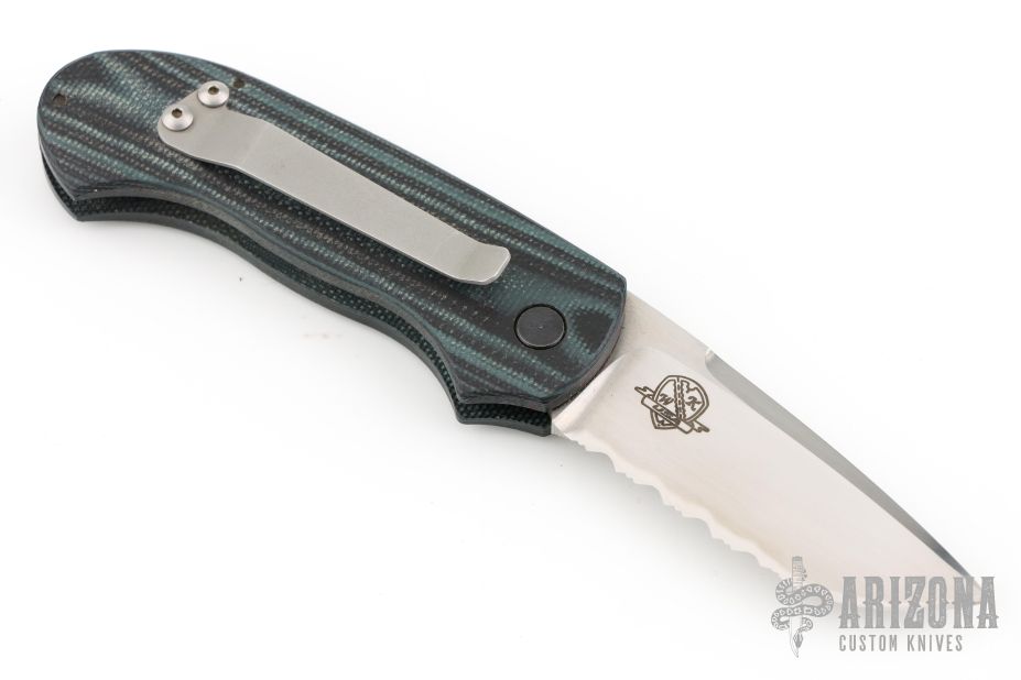 This Pocket Pro Side Opening Automatic from Woodard Knives features hand rub satin finished drop point blade with serrations and a swedge. The handle is comprised of black and green G-10 scales and backspacer with a stainless steel tip up clip. Comes in original box. Excellent condition.